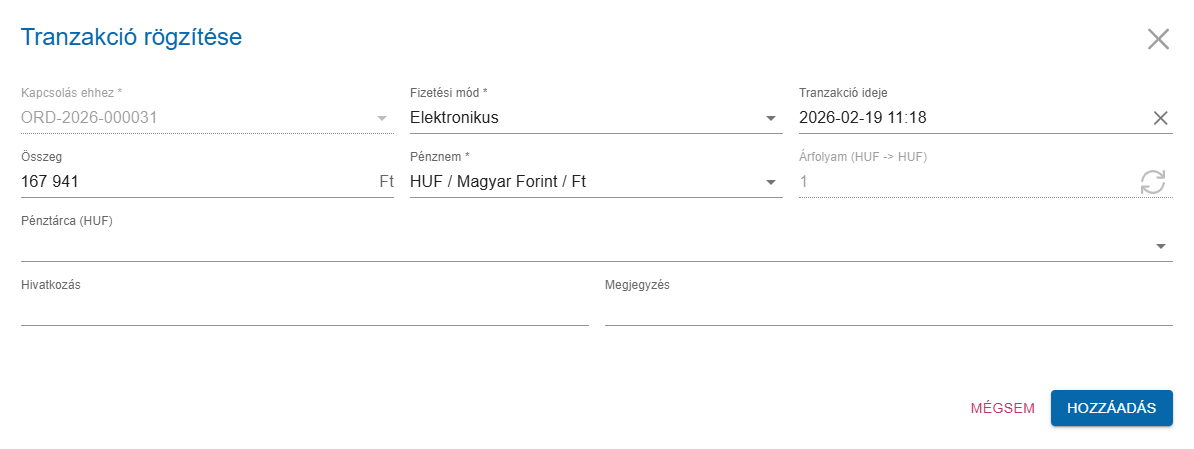 Új tranzakció rögzítése rendelés szerkesztő nézetben