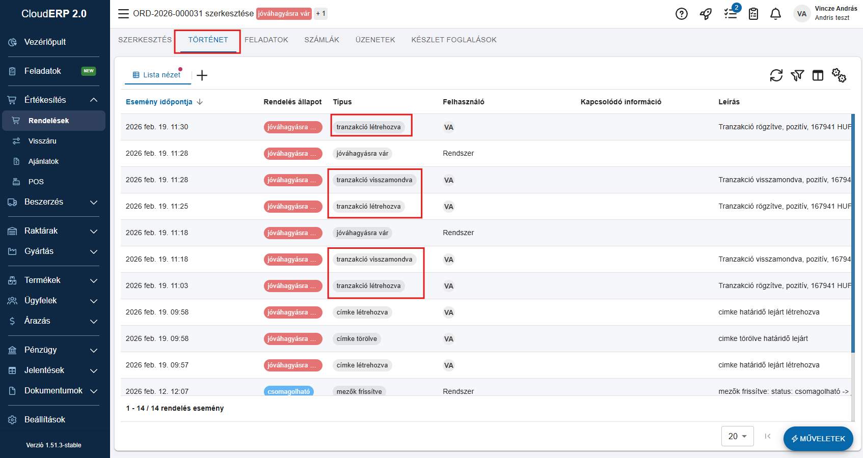 Minden tranzakciós esemény bekerül a rendelés törtébetbe is