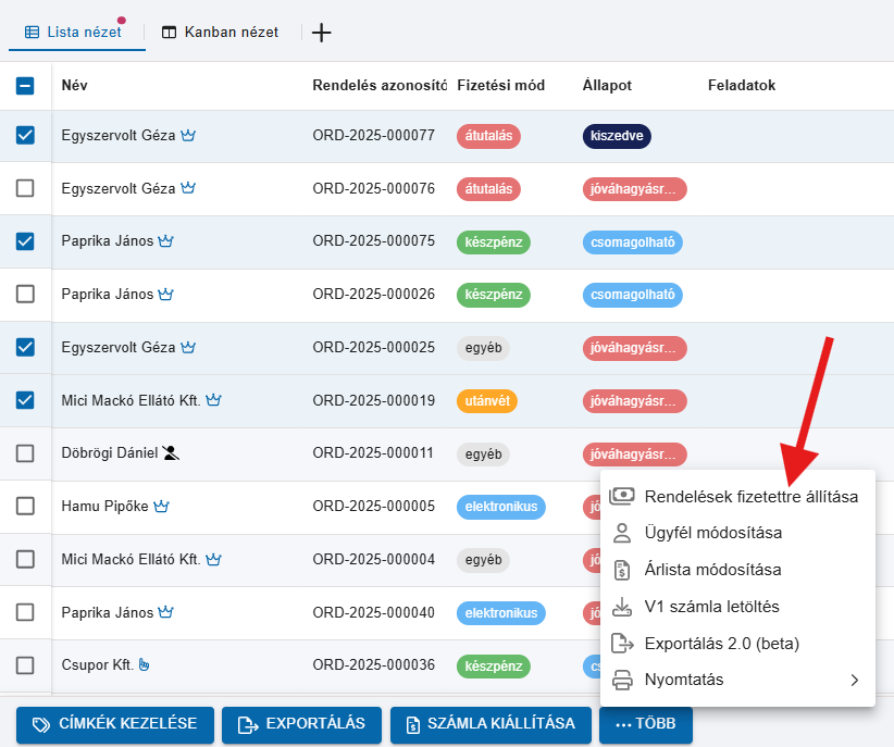 A funkció lényege, hogy ha több eltérő fizetési módú rendelést jelölök ki, akkor is elérhető a Rendelések fizetettre állítása funkció.