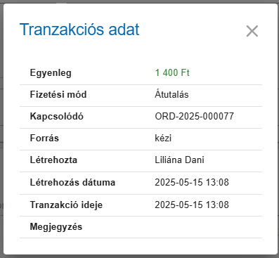 A tranzakcióra kattintva, látszik, hogy melyik felhasználó, mikor hozta létre ez a tranzakciót. Tömeges fizetettre állítás esetén a létrehozás dátuma és a tranzakció ideje a művelet végrehajtásának időpontja lesz.