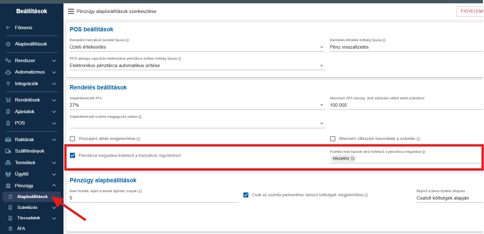 A Beállítások/Pénzügy/Alapbeállítások menüben található egy beállítási lehetősége, amellyel lehetséges engedélyezni néhány fizetési módra, hogy kötelező legyen a pénztárca hozzáadása. Ehhez először be kell pipálni a "Pénztárca megadása kötelező a tranzakció rögzítéshez!" mezőt és ha ezt engedélyezzük, akkor tudunk kiválasztani fizetési módokat, amikre kötelező a pénztárca kiválasztása.