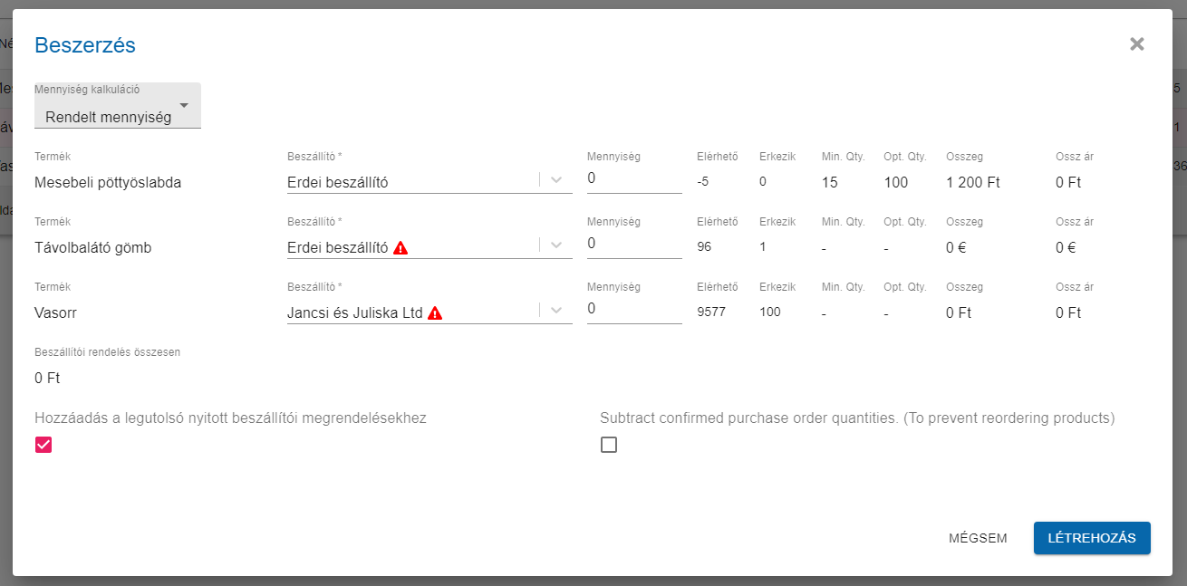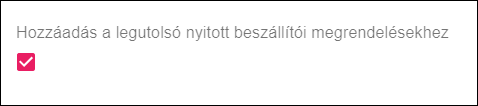 Ha bejelölöd a “Hozzáadás a legutolsó nyitott beszállítói megrendelésekhez” lehetőséget, akkor nem új beszállítói megrendelés jön létre, hanem az adott beszállító(k) megrendelését bővíted fel.