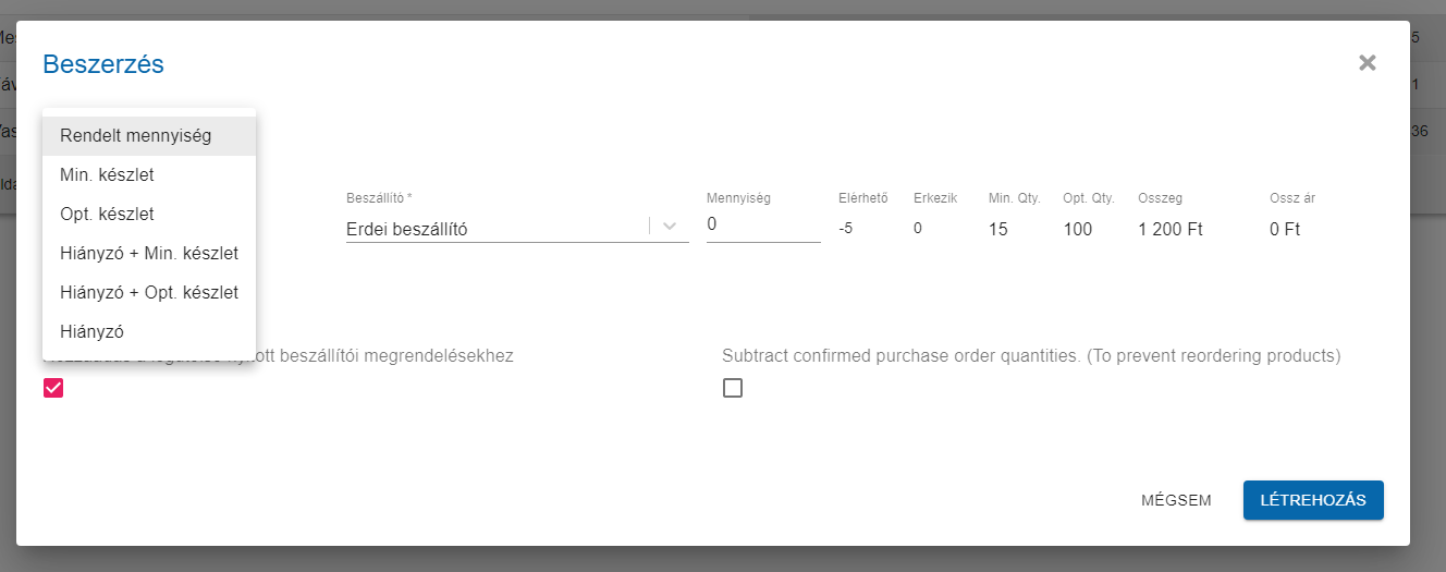 Például nap közben kiderül, hogy még valamit meg kell rendelned egy vagy több termékből. Van nyitott beszerzésed, amit még nem küldtél el a beszállítónak. Ebben az esetben, ha bejelölöd a “Hozzáadás a legutolsó nyitott beszállítói megrendelésekhez” opciót, akkor nem új beszerzés jön létre, hanem bővítésre kerül a korábbi beszerzés.