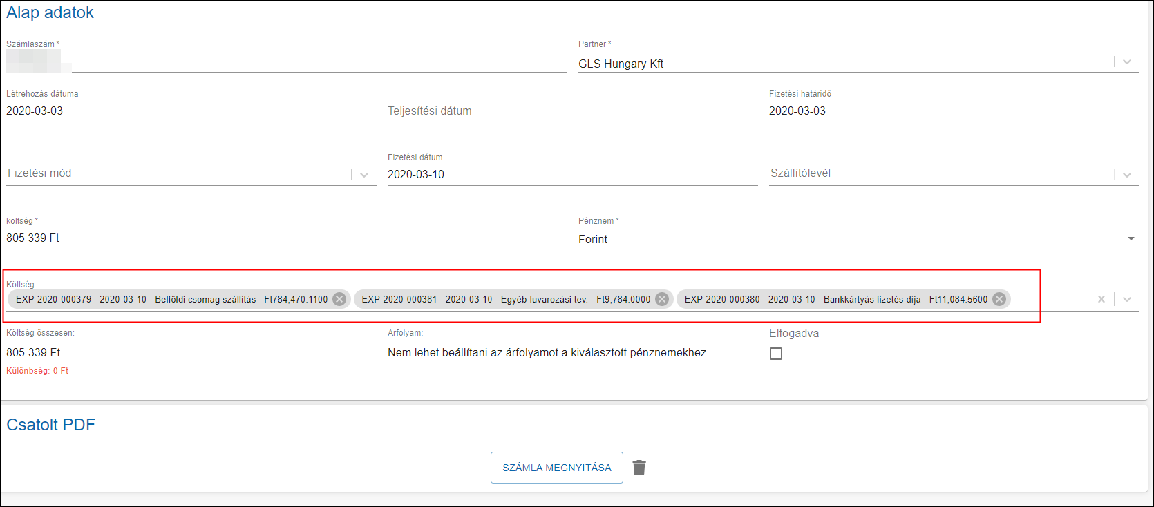 A fenti képen egy számla szerepel, amihez három költség van rendelve. Tehát ezek a költségek a számla tételei. Lehet látni, hogy a számla végösszege (805 339 Ft) egyezik a három költség összegével. (Különbség:0)
