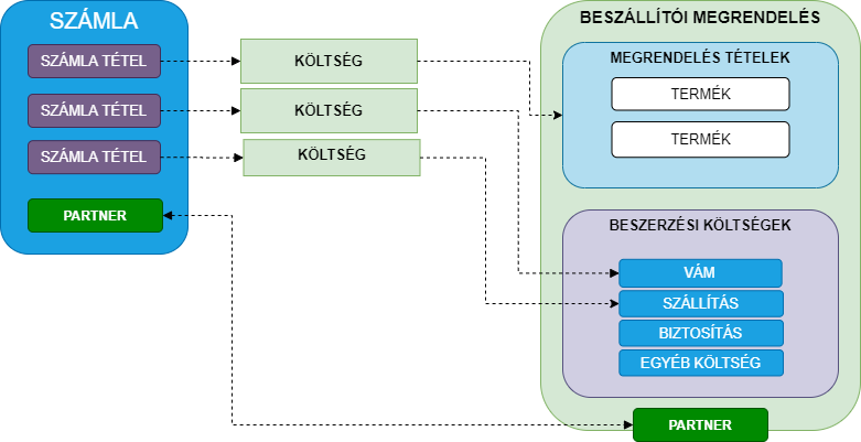 A beszerzéssel kapcsolatos költségek a beszállítói megrendeléssel összekapcsolhatóak. Ez azt jelenti, hogy a költségeket párosítani tudjuk vagy a beszállítói megrendeléssel (tételek) vagy a beszállítás költségeivel. Ezt kapcsolatot csak azonos partnerek esetén lehet megtenni. Vagyis mind a költségnek mind a beszállítói megrendelésnek ugyanahhoz a partnerhez kell tartoznia.