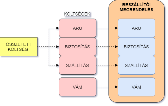 A fenti rajzon látható, hogy egy összetett költséget fel kell bontani olyan egységekre, amelyek már megfeleltethetőek a beszállítói rendelés tételeinek. Ebben az esetben egyszerre utaltuk el az áru+biztosítás+szállítás költségét. Ezért felbontottuk és egyesével mindegyiket összekapcsoltuk a beszállítói megrendelés egyik tételével.