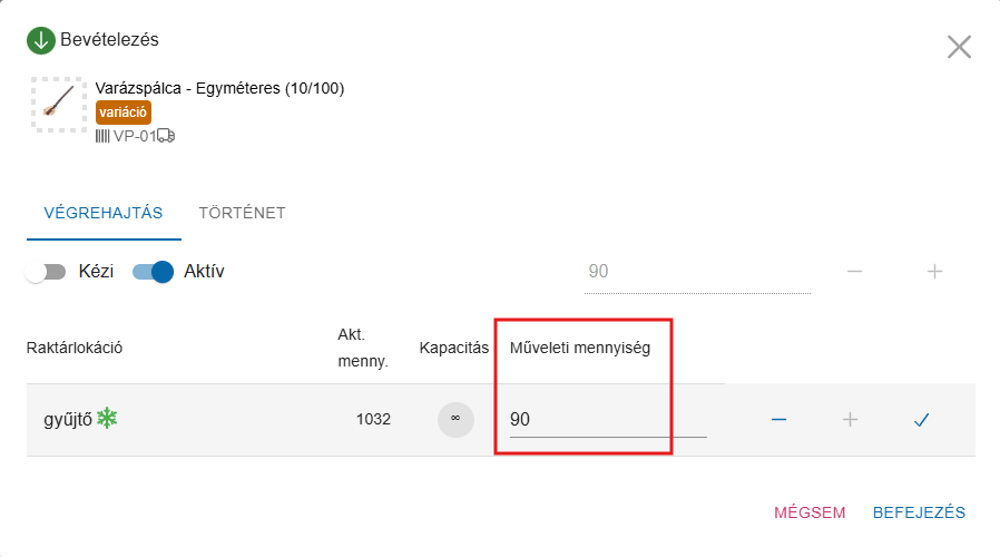 Ha kevesebbet akarsz bevételezni, mint a teljes cél mennyiség, akkor add az új mennyiséget. Miután átírtad a mennyiséget, a műveleti mennnyiség frissülni fog. Ezek után, ha megnyomod a pipát, csak annyi kerül bevételezésre, amennyit megadtál.