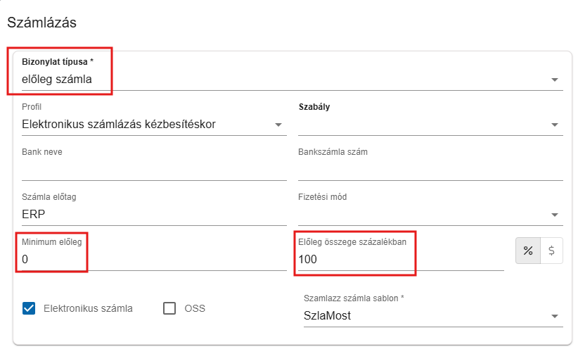 | Minimum előleg | Minimum érték, amit a rendelés összegnek el kell érnie, hogy előlegszámla készüljön | Automatizmusban használt kapcsoló. Manuális számlázásnál 0 értékre állítsd |
