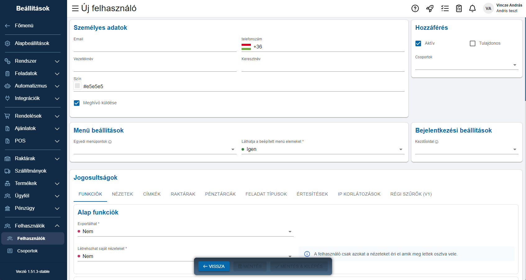 Megadható, hogy egyes funkciókhoz hozzáférhet-e vagy sem a felhasználó, pénztárcáknál, raktáraknál milyen jogosultsági szintje van, milyen címkékhez, értesítésekhez, nézetekhez férhet hozzá, milyen menüpontokhoz férhet hozzá.