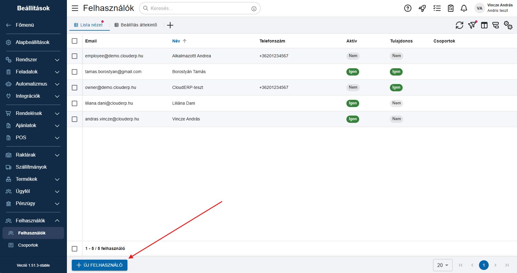 Válaszd a Beállítások => Felhasználók => Felhasználók menüpontot és nyomd meg a bal oldalon az új felhasználó gombot.