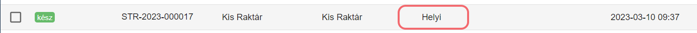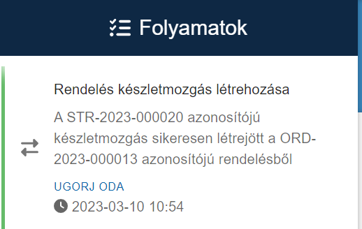 Ha bepipálva hagyjuk és az OK gombbal létrehozzuk a készletmozgást, ez azt eredményezi, hogy automatikusan létrejön a rendelés készletmozgása helyi szállítási móddal, kész állapotba kerül és automatikusan végrehajtásra kerül egy kivételezési és egy bevételezési raktárművelet is.