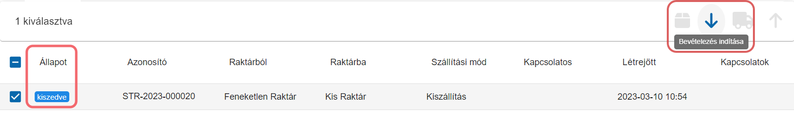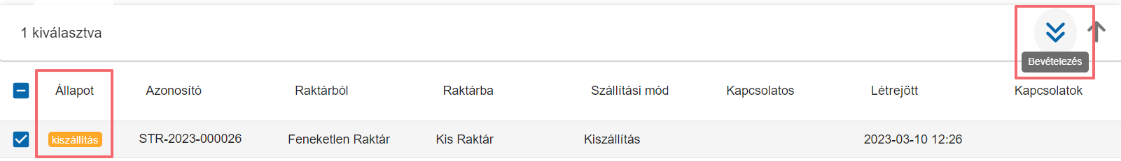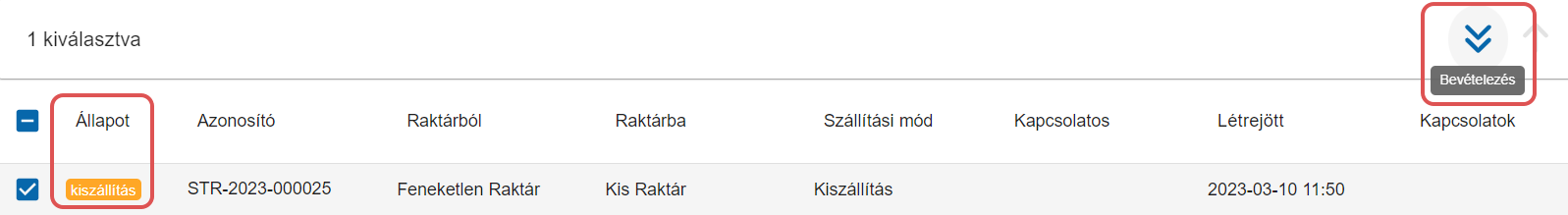 Ekkor a készletmozgás státusza átvált kiszállítás státuszra. A készletmozgást kijelölve válasszuk a Bevételezés műveletet.