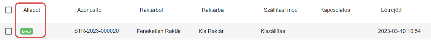 A készletmozgás automatikusan Kész státuszt kap, a szállítás is megtörténik és a kivételezési, illetve a bevételezési raktárműveletek és automatikusan végrehajtásra kerülnek.