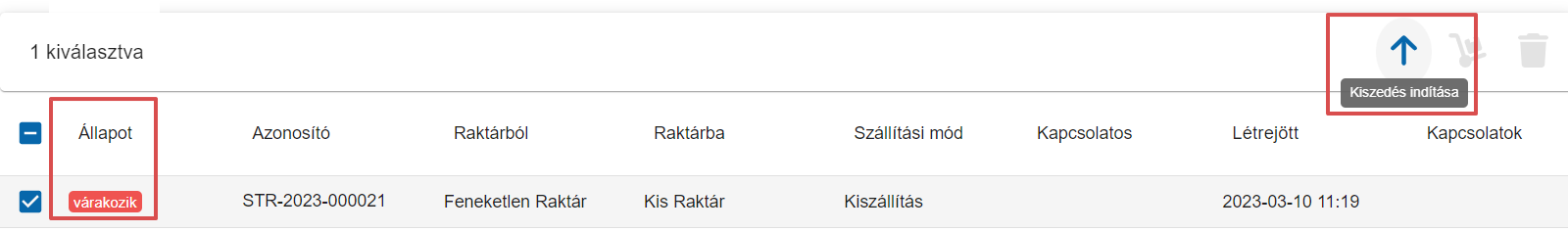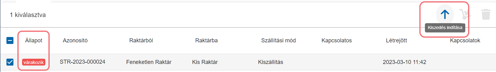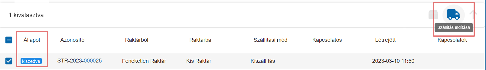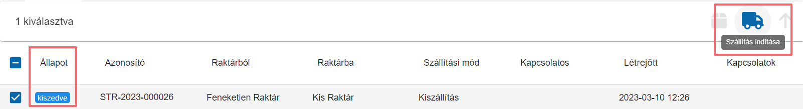 Jelöljük ki a készletmozgást és válasszuk a Szállítás indítása műveletet.