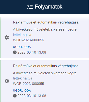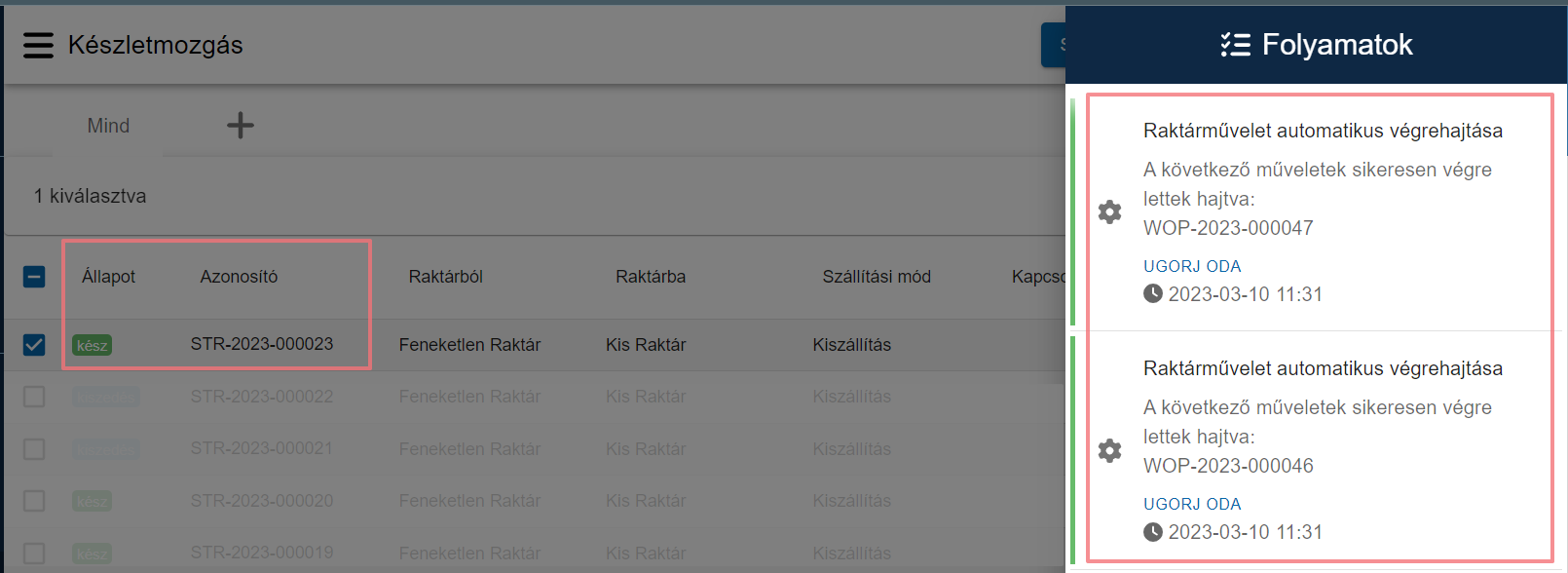 Automatikusan végrehajtja és várakozik státuszból kész státuszba kerül a listában a készletmozgásunk, illetve létrejönnek a kivételezési és bevételezési raktárműveletek is.