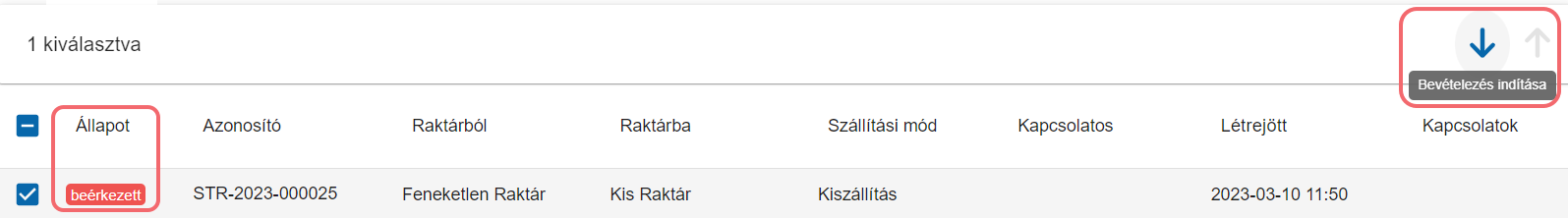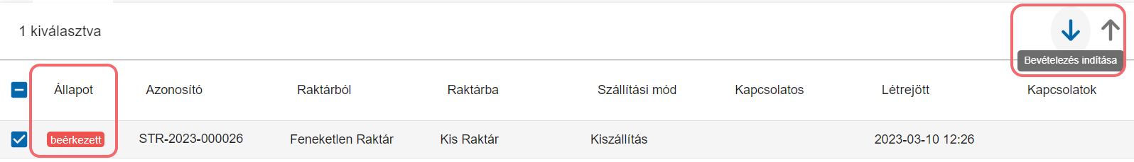 A készletmozgás státusza Beérkezett lesz. Ekkor jelöljük ki a készletmozgást és a Bevételezés indítása műveletet válasszuk ki.