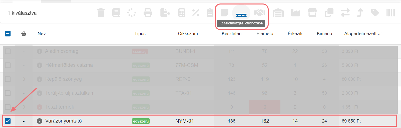 A Termékek listából jelöljünk ki egy terméket, majd válasszuk a Készletmozgás létrehozása műveletet.