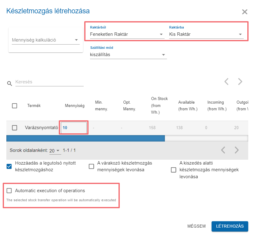 A Készletmozgás létrehozása felugró ablakból kiválasztom a forrás és a cél raktárat, beállítom a mennyiséget, majd mivel a Beállításokban így rendelkeztem, így alapértelmezetten be van pipálva a "Műveletek automatikus végrehajtása" mező. Kattintsunk a Létrehozás gombra.