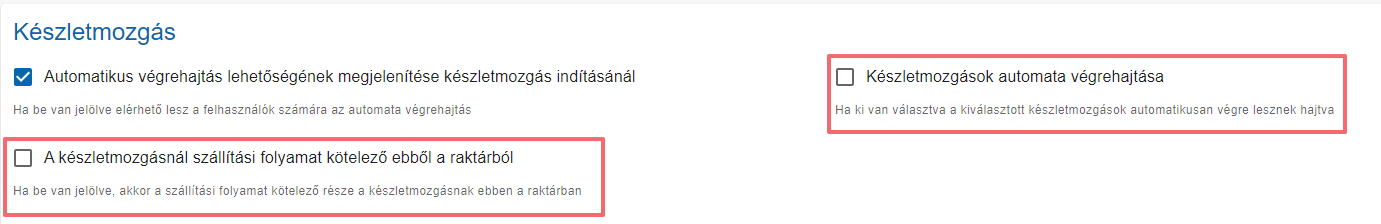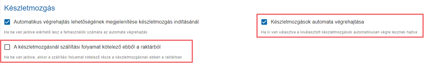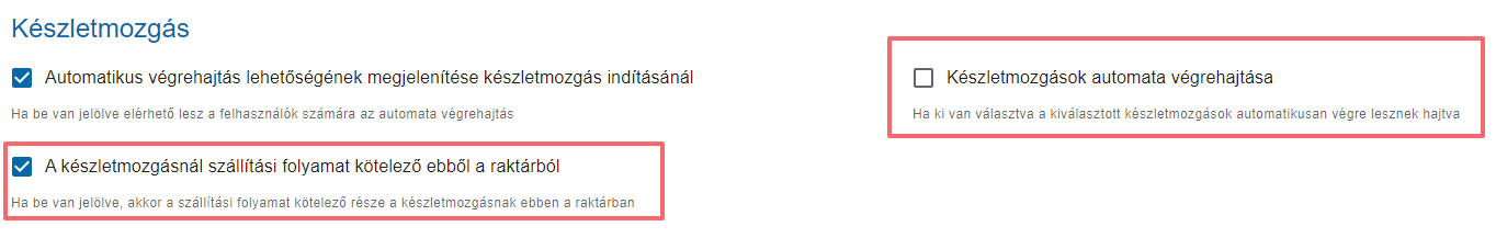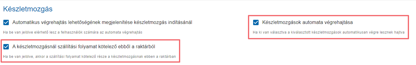 2. "Készletmozgások automata végrehajtása" engedélyezve és "A készletmozgásnál szállítási folyamat kötelező ebből a raktárból" engedélyezve