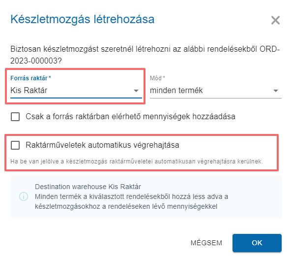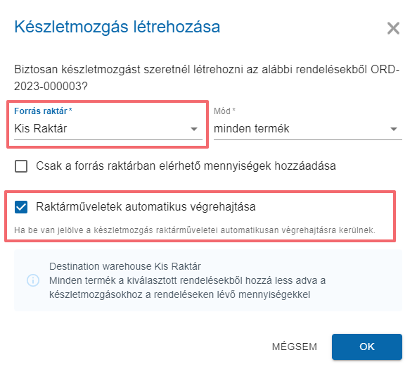 Automatikusan megjelenik egy felugró ablak, amelyen kiválasztható a Forrás raktár. Ebben az esetben ha a forrás raktárnál bepipálásra került a "Készletmozgások automata végrehajtása" mező, úgy automatikusan megjelenik a "Műveletek automatikus végrehajtása" mező és be is van pipálva.