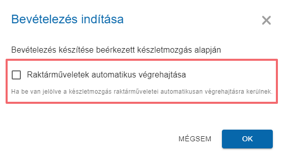 Automatikusan megjelenik a Bevételezés indítása felugró ablak, amiben alapértelmezetten nincs bepipálva a a "Raktárműveletek automatikus végrehajtása" mező. Kattintsunk az OK gombra.