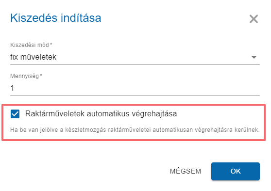 Megjelenik a Kiszedés indítása felugró ablak, amelyben automatikusan be van pipálva a "Raktárműveletek automatikus végrehajtása" mező, az OK gombbal jóváhagyjuk.