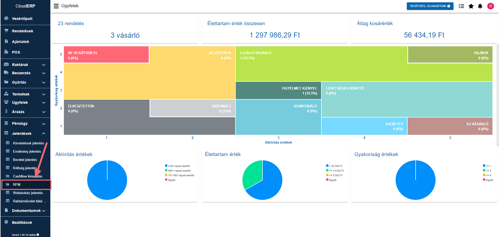 A Jelentések/RFM menüben érhető el a saját vállalkozásunk RFM kimutatása.